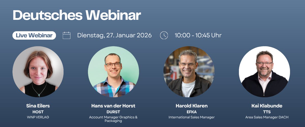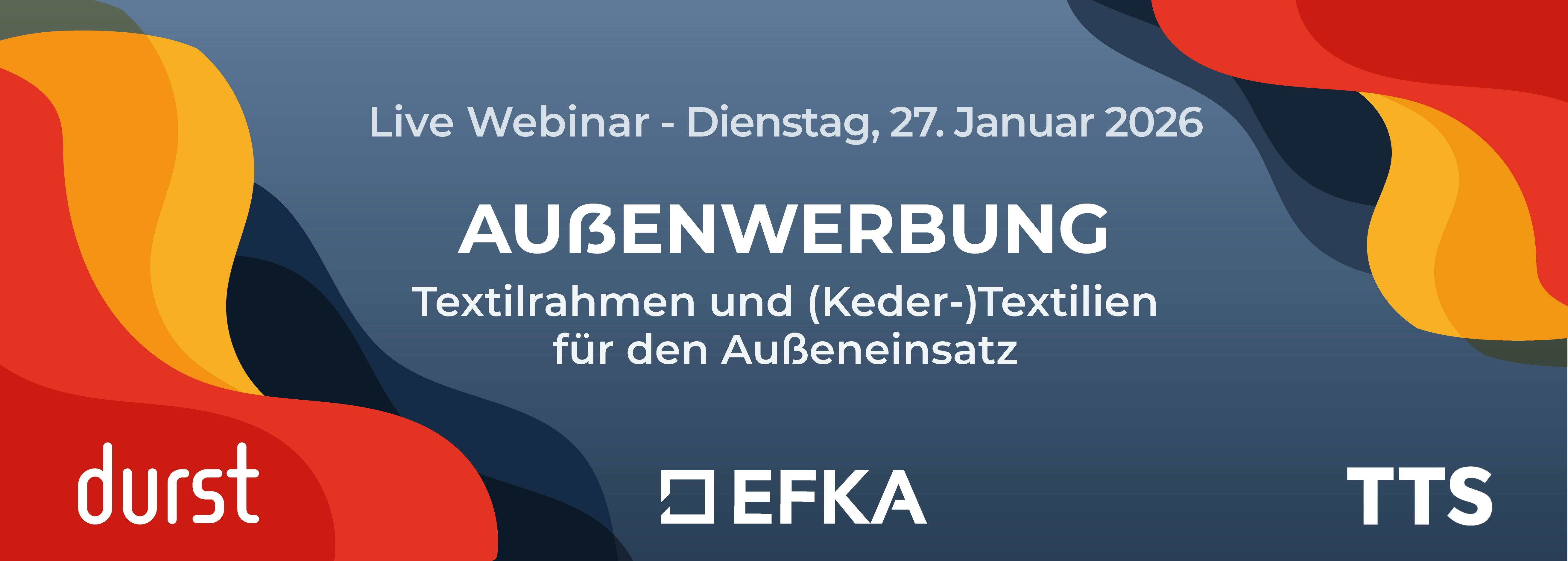 In diesem 45-minütigen Webinar erfahren Sie, wie Sie mit der optimalen Kombination aus Textilrahmen, Stoffen und Drucktechniken auch im Außenbereich einen starken und nachhaltigen Eindruck hinterlassen. Unsere Expertinnen und Experten von EFKA, Durst und Texo Trade Services (TTS) geben Ihnen praxisnahe Einblicke und wertvolle Tipps, die Sie sofort umsetzen können.
